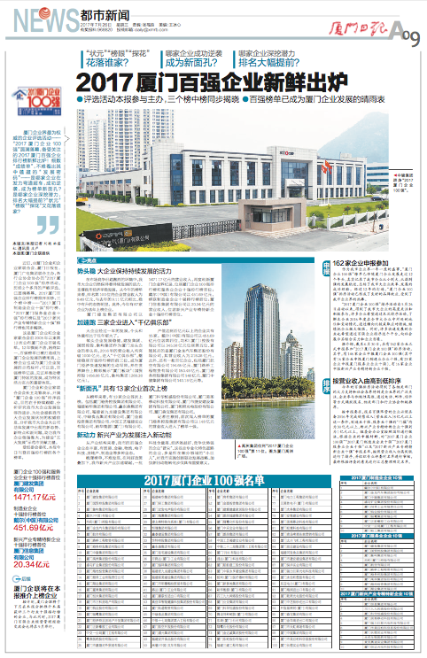 ?? ? ? 近日,由廈門企業(yè)和企業(yè)家聯(lián)合會(huì)、廈門日?qǐng)?bào)社、廈門廣電集團(tuán)聯(lián)合主辦,各行業(yè)協(xié)會(huì)協(xié)辦的“2017廈門企業(yè)100強(qiáng)”排序活動(dòng),歷經(jīng)2個(gè)多月的嚴(yán)格評(píng)選,已圓滿落幕。2017廈門百?gòu)?qiáng)企業(yè)排行榜掀開(kāi)面紗,三個(gè)榜中榜——“2017廈門制造業(yè)企業(yè)十強(qiáng)”排行榜、“2017廈門服務(wù)業(yè)企業(yè)十強(qiáng)”排行榜以及“2017新興產(chǎn)業(yè)專精特新企業(yè)十強(qiáng)”排行榜也同步揭曉。